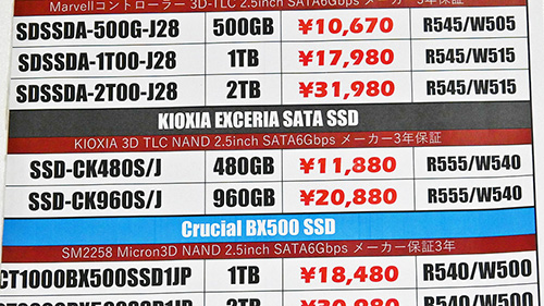 ほかにも、Samsung「870 EVO」4TBが3,999円高の68,979円、ADATA「SU650」960GBが4,820円高の17,800円、Apacer「AS350X」512GBが2,980円高の10,980円、MSI「SPATIUM S270」960GBが7,100円高の19,980円、480GBが3,600円高の10,480円、Verbatim「Vi550」512GBが2,700円高の9,980円など。引き続き値上がりの動きが顕著だ。