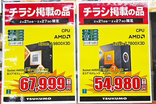 AMD Ryzen 9000シリーズを中心に下落、「Ryzen 7 9800X3D」は20%安の67,999円で特売 [2月後半のCPU価格]