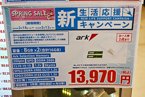 DDR4メモリは、「DDR4-2666」16GB×2枚組が6,010円(18.2%)安の26,970円(SanMax/SK-HYNIX)、16GB×2枚組が3,010円安の13,970円(ARKセレクション/SK-HYNIX)で特売。それぞれ今回調査のDDR4 DIMM 2枚組としては最安だ。