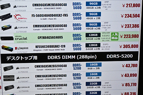 DDR5 SO-DIMMは単体品(1枚売り)に動き。「お一人様1点まで」との条件付きながら、「DDR5-5600」32GBが10,180円(17.0%)安の49,800円(Corsair)、24GBが26,100円(43.9%)安の33,300円(同)で限定特売中だ。16GBは7,190円(20.6%)安の27,790円(Crucial)で、平均価格も8,438円(21.6%)下落した。