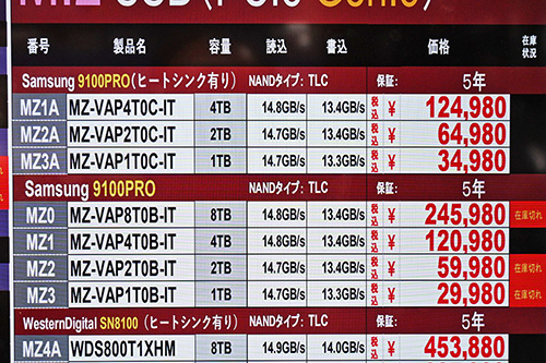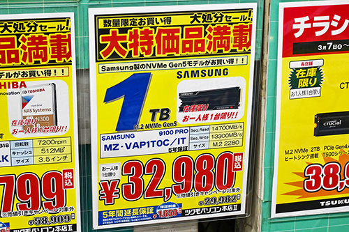 なお、「9100 PRO」の1TBモデルは今回値上がりしておらず、ヒートシンク非搭載版は29,980円で横ばい。搭載版は2,000円安の特価32,980円だ。