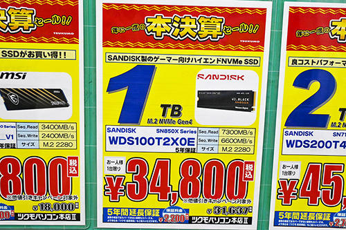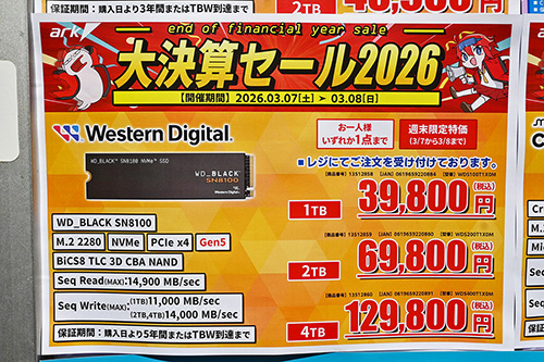 また、「SN7100」は2TBが4,000円安の45,980円、500GBが1,810円安の17,990円など特売。1TBも特価26,980円だが、前回17,980円という極端な安値があったため、最安値としては9,000円の上昇となっている。