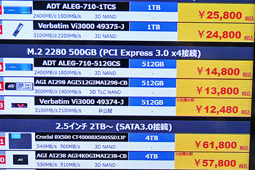 キオクシアは「EXCERIA BASIC」は1TBが品薄化し、特価の終了もあって3,900円高の21,880円に上昇。ADATAは「LEGEND 960」4TBが7,000円安の112,800円、「LEGEND 900」2TBが4,000円安の46,800円など値下がりした。