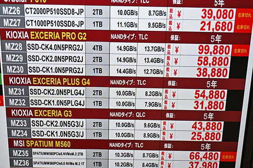 このほかは、ADATA「MARS 980 BLADE」2TBが2,180円安の56,800円、1TBが1,180円安の30,800円、Crucial「T705」ヒートシンク搭載4TBが1,200円安の97,980円など。キオクシア「EXCERIA PRO G2」は在庫ショップ数が減っており、4TB(前回調査で99,880円)が品切れだ。