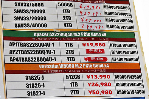 上記を除くPCIe 4.0/3.0対応SSDの最安値は、4TBがWestern Digital(Sandisk)「WD Blue SN5000」で139,980円(1GB単価35.0円)、2TBがApacer「AS2280P4X」で30,980円(15.1円)、1TBがMSI「SPATIUM M450」19,800円(19.8円)、500GBクラスがVerbatim「Vi3000」で12,480円(24.4円)、250GBクラスがApacer「AS2280P4X」7,260円(28.4円)。2TBと250~500GBクラスは今回のM.2/NVMe SSDで最も安価だ。
