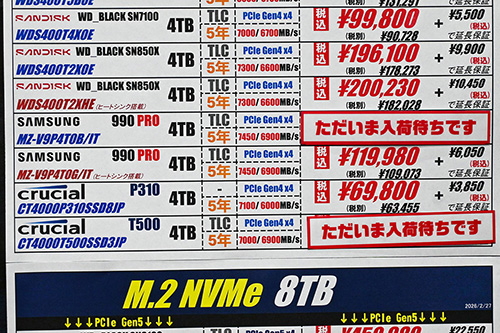 一方で、Samsung「9100 PRO」は最大23%の上昇を記録。ヒートシンク搭載4TBが15,000円(13.6%)高の124,980円、2TBが10,000円(18.2%)高の64,980円、非搭載8TBが46,000円(23.0%)高の245,980円、4TBが21,000円(21.0%)高の120,980円、2TBが10,000円(20.0%)高の59,800円に上がった。