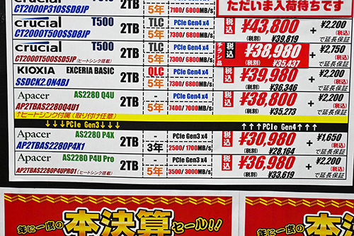 | Crucial T500 CT4000T500SSD5(4TB,PCIe 4.0) | 2 | 87,580 | +12,780 | 97,690 | +15,950 |