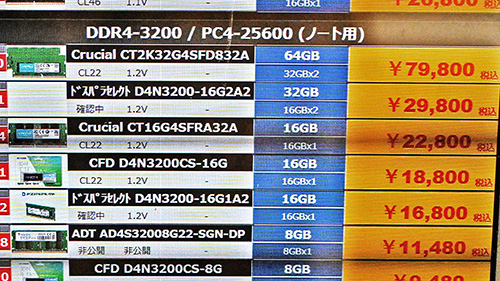 DDR4-DIMMは、「DDR4-3200」16GB×2枚組が4,520円(13.2%)安の29,800円(ADATA)に下落。ただし、3万円を切るのは1例だけで、多いのは35,000~40,000円前後だ。32GB×2枚組は69,300円(SanMax)で前回と同じだが、平均では810円(1.1%)下がっている。