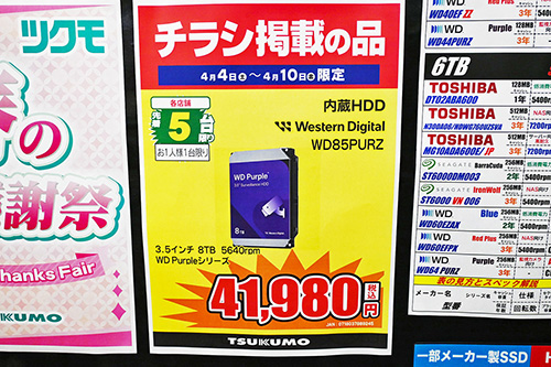 Seagateは、「IronWolf」ST8000VN002(8TB)が3,200円安の33,480円で特売。「IronWolf Pro」ST32000NT000(32TB)は再び品切れとなった。Western Digitalは「WD Purple」WD85PURZ(8TB)が1,820円安の41,980円で特売されているほか、WD34PURZ(3TB/キャッシュ128MB)が18,880円で出回り始めている。