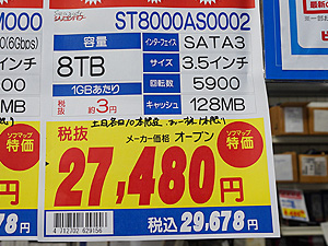 引き続きSeagateの値動きが目立ち、Archive HDDシリーズに属するST8000AS0002(8TB)が前回比2,080円安の税込28,920円に、ST6000AS0002(6TB)が1,724円安の税込23,980円に下がった。