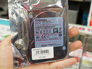 新製品では、東芝から2.5インチHDD初の3TBモデル、MQ03ABB300が9月下旬に発売された。スピンドル回転数は5,400rpmで、キャッシュメモリ16MB搭載。本体の高さ(厚み)が15mmあり、主流の7~9.5mmより大柄だ。当初の最安値は税込22,680円で、2TBのMQ01ABB200と比べて約2倍だったが、10月24日調査時は税込20,980円に下がっている。