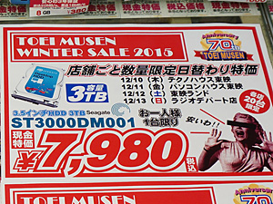 11月下旬、Seagate ST3000DM001が一部ショップで7,980円を付け、3TBモデルとして初の8,000円割れを記録した。一時的な特売かと思われたが、12月19日の調査でも税込7,971円が見られた。