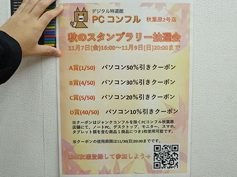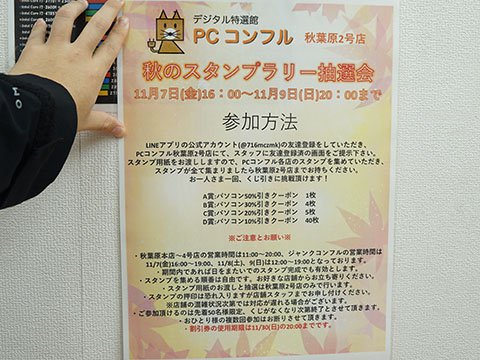 スタンプ用紙の配布と抽選はPCコンフル 秋葉原2号店で行う。