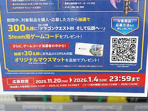 CORSAIRの対象PCケースや水冷CPUクーラー、ゲーミングデバイスを購入した300名に抽選でHD-2D版「ドラゴンクエストIII そして伝説へ…」Steam用ゲームコードをプレゼント。