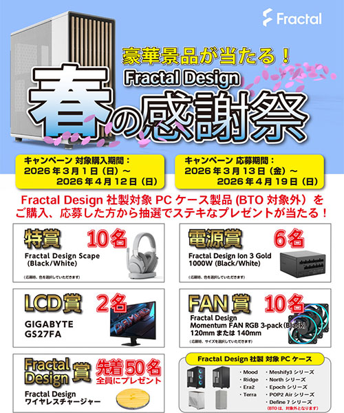 景品は特賞 Fractal Design Scape Dark/Light(10名)、電源賞 Fractal Design Ion 3 Gold 1000W Black/White(6名)、LCD賞 GIGABYTE GS27FA(2名)、FAN賞 Fractal Design Momentum RGB 3-pack Black 120/140mm(10名)、Fractal Design賞 オリジナルワイヤレスチャージャー(先着50名)。