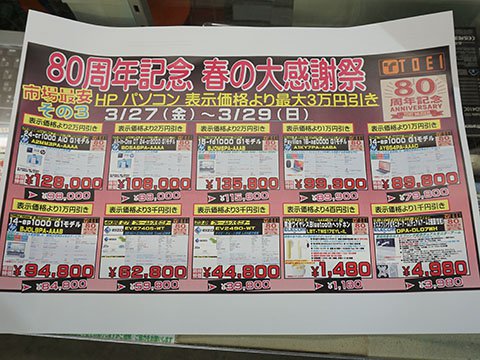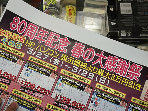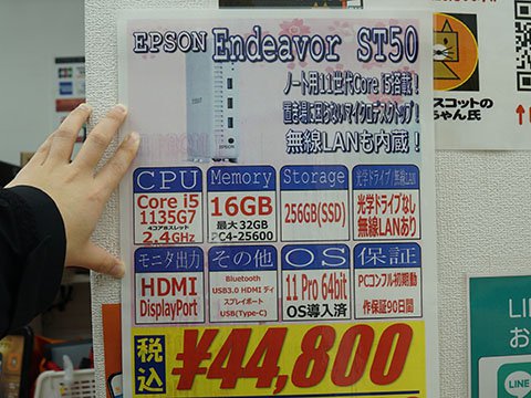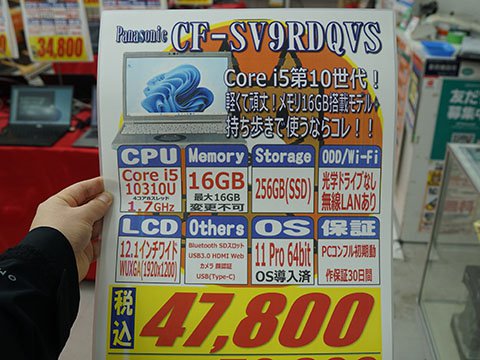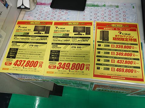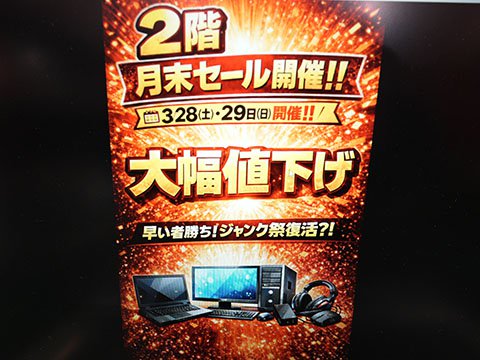 その他のお買い得情報アキバお買い得価格情報(速報版) 【 調査日:2026年3月26日 】 AKIBA PC Hotline!編集部2026年3月27日 00:20※以下における価格などは、編集部が各ショップ店頭での表示を独自調査したものです。 この価格で販売されることを保証するものではありません。 実際の販売価格は変動しますので、購入時に各ショップ店頭にてご確認ください。※特記無き価格情報は税込価格です。.テクノハウス東映「80周年記念 春の大感謝祭」を27日(金)から実施.PCコンフル 秋葉原4号店Core i5-1135G7搭載のLatitude 5320 中古品が47,800円.ツクモパソコン本店/本店IIAGI外付けSSD 1TBが9,980円など、「年に一度の本決算セール!!」を実施中AED(自動体外式除細動器)を設置 ツクモパソコン本店の1階に設置している。 .PCコンフル 秋葉原2号店Core i5-1135G7搭載のEndeavor ST50 中古品が44,800円.OraOrA! Returns 秋葉原店ジャンクセールを28日(土)~29日(日)に実施 「2階の製品を入れ替える」「大幅値下げ」(同店)とのこと。 .PCコンフル 秋葉原本店Core i5-10310Uや16GBメモリ搭載のCF-SV9RDQVS 中古品が47,800円.ソフマップAKIBA パソコン・デジタル館ASRock製マザーボードのセールを実施、X870 Riptide WiFiが29,800円など 「商品入れ替え特価」「在庫は潤沢にある」(同店)とのこと。 .PCコンフル 秋葉原3号店Core i7-1185G7やメモリ32GB搭載のLIFEBOOK U9311/Fが64,800円など、中古品PCのセールを実施.TSUKUMO eX.BTO PCなどのセールを実施その他の秋葉原セール情報はこちら