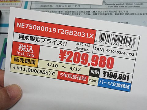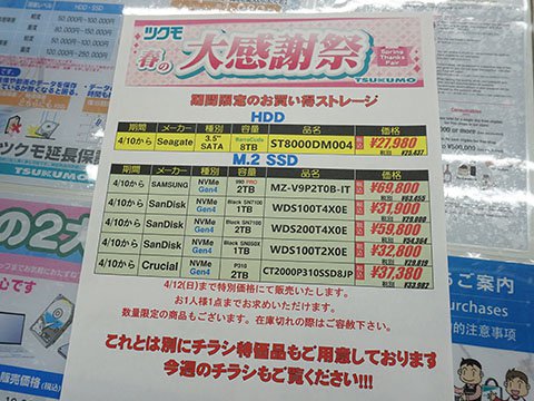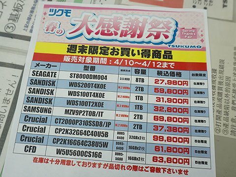 その他のお買い得情報アキバお買い得価格情報(速報版) 【 調査日:2026年4月9日 】 AKIBA PC Hotline!編集部2026年4月10日 00:20※以下における価格などは、編集部が各ショップ店頭での表示を独自調査したものです。 この価格で販売されることを保証するものではありません。 実際の販売価格は変動しますので、購入時に各ショップ店頭にてご確認ください。※特記無き価格情報は税込価格です。.テクノハウス東映OKIレーザープリンタの箱破損消耗品が入荷、トナーカートリッジなど.家電のケンちゃんPC-6001/6601版 特攻空母ベルーガ カートリッジ版 未使用品が55,000円.PCコンフル 秋葉原4号店Core i5-1135G7搭載のThinkPad X13 Gen2が42,800円など、中古品PCのセールを実施.ツクモパソコン本店/本店IIRyzen 7 9700X + ASUS STRIX B650-A GAMING WiFiセットが56,980円など、週末セールを実施日立LG製スーパーマルチDVDドライブ「GHE0N BK」が再入荷.UT-PC&Mobile 秋葉原店M1 Maxやメモリ64GB搭載のMacBook Pro(2021)が155,000円など、中古品セールを実施.PCコンフル 秋葉原本店Core i5-8365U搭載のLatitude5300が27,800円など、中古品PCのセールを実施.ソフマップAKIBA パソコン・デジタル館中古品ビデオカードなどのセールを実施、GeForce RTX 3050 S.A.Cが19,980円などGeForce RTX 5070 + Ryzen 7 7800X3D搭載のozgaming Z1B-R78D-5070B650が299,800円など.PCコンフル 秋葉原3号店Core i5-10500T搭載のESPRIMO Q7010/H 中古品が37,800円.BEEP 秋葉原店「矢口高雄の世界 ART WORK 1969-2020」が入荷、価格は1,650円NES版ドラゴンスピリットの中古品が17,800円など.ジャンクコンフル秋葉原店256GB SATA-SSD ジャンク品が3,000円など、週末セールを実施限定20個手のひら静脈認証デバイス再入荷.TSUKUMO eX.Seagate 8TB HDDが27,980円など、週末セールを実施その他の秋葉原セール情報はこちら