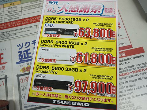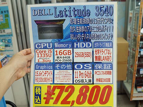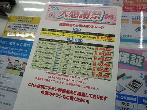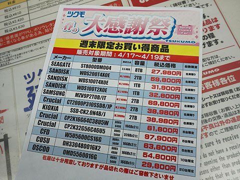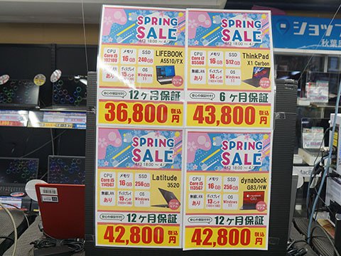 その他のお買い得情報アキバお買い得価格情報(速報版) 【 調査日:2026年4月16日 】 AKIBA PC Hotline!編集部2026年4月17日 00:20※以下における価格などは、編集部が各ショップ店頭での表示を独自調査したものです。 この価格で販売されることを保証するものではありません。 実際の販売価格は変動しますので、購入時に各ショップ店頭にてご確認ください。※特記無き価格情報は税込価格です。.PCコンフル 秋葉原4号店Core i5-1335U搭載のLatitude 3540が72,800円など、中古品PCのセールを実施.テクノハウス東映「80周年記念セール」を実施中.ツクモパソコン本店/本店IISeagate 8TB HDDが27,980円など、週末セールを実施.あきばお~弐號店小型カメラ「Wi-Fiピタッとカメラ」が1,100円.UT-PC&Mobile 秋葉原店AQUOS wish5 開封済み未使用品が19,800円など、週末セールを実施.PCコンフル 秋葉原本店Core i5-1135G7搭載のThinkPad X1 Carbon 9th Genが47,800円など、中古品PCのセールを実施.ソフマップAKIBA パソコン・デジタル館OZGamingのゲーミングPCを一部値下げ、Ryzen 7 5700X + GeForce RTX 5060搭載モデルが198,800円など.ショップインバース秋葉原2号店中古品PCのセールを実施中、Core i5-10210U搭載のLIFEBOOK A5510/FXが36,800円など.PCコンフル 秋葉原3号店Ryzen 5 5600U搭載のProBook 635 Aero G8が47,800円など、中古品PCのセールを実施.BEEP 秋葉原店PSP METALGEARSOLID PORTABLE OPS PREMIUM PACK 中古品が64,800円など.TSUKUMO eX.週末セールを実施その他の秋葉原セール情報はこちら