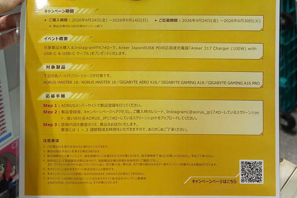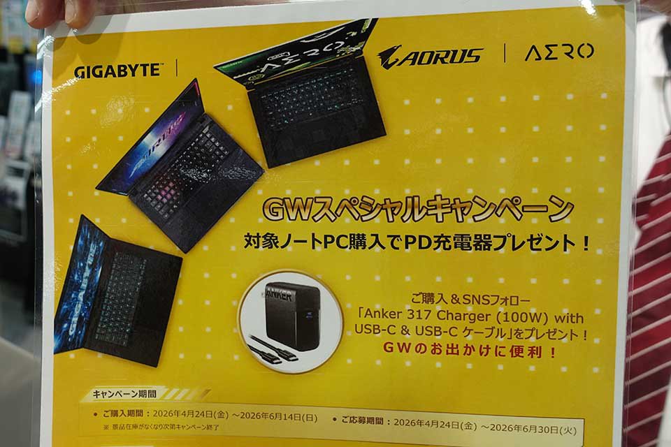 4月24日(金)~6月14日(日)の期間中に、同社指定のノートPCを購入し、GIGABYTE公式SNSアカウント(InstagramもしくはX)をフォローした人が対象のキャンペーン。