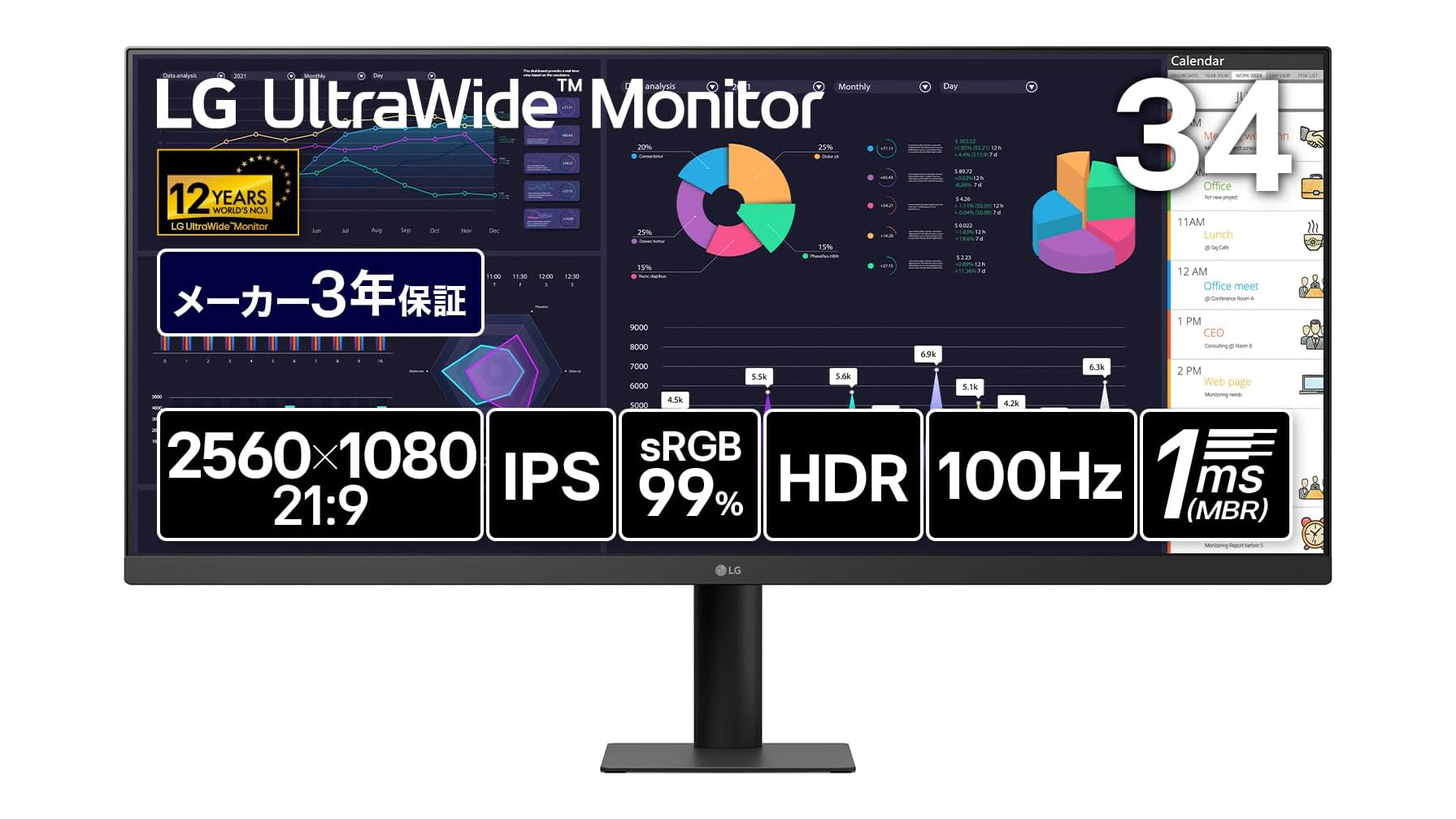 LG UltraWide Monitor 34U511A-Bは、34インチの横長画面で作業効率を高めるDisplayHDR 400対応のIPSウルトラワイドモニター。セール価格は34,800円。
