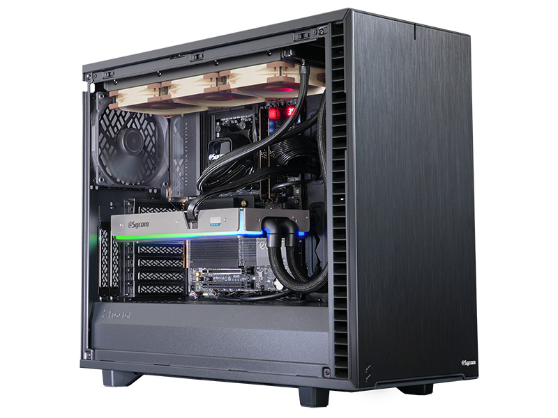 10基の冷却ファンを搭載したことで強力な冷却性能と、プリズムカット構造&ハーフミラーケースデザインと、RGB LEDからなる美しいイルミネーションにより高性能かつ高ビジュアルを兼ね備えた魅力溢れるパソコンに仕上がっております!