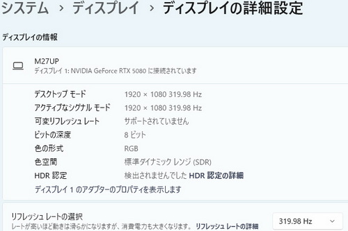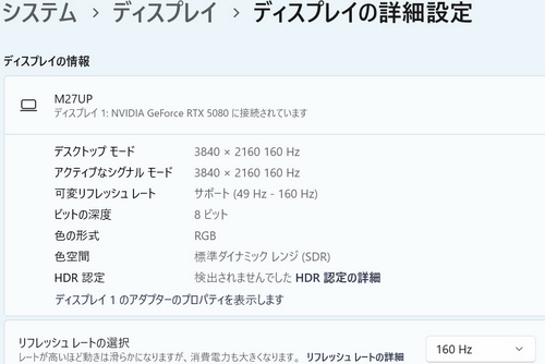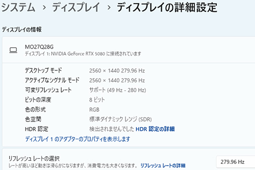 IPSパネルを採用しており、OLEDほどではないがDCI-P3カバー率95%、sRGBカバー率125%と広色域だ。「Display HDR400」認証を取得しており、HDRコンテンツも楽しめる。応答速度は1ms(GTG)とIPSパネルとしては十分高速だ。DisplayPort、HDMI、Type-Cとも4K/160Hz、フルHD/320Hzでの表示に対応している。可変リフレッシュレート(VRR)機能はAMD FreeSync Premium、NVIDIA G-SYNC Compatibleをサポート。筆者がGeForce RTX 5080でNVIDIAアプリにてG-SYNCが利用できるのを確認した。