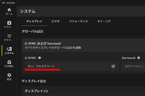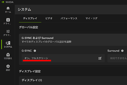 画面のテアリング(画面ズレ)やモタつきを防ぐ可変リフレッシュレート(VRR)機能はAMD FreeSync Premium Pro、NVIDIA G-SYNC Compatibleをサポート。筆者がGeForce RTX 5080でNVIDIAアプリにてG-SYNCを有効化し、問題なく動作することを確認した。