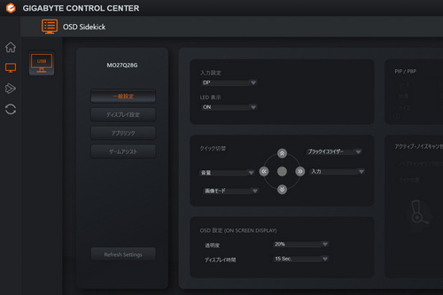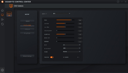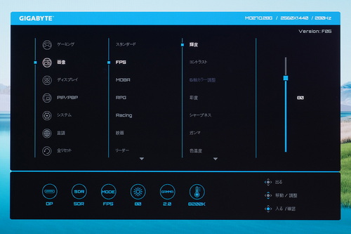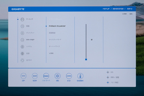 暗部を明るく補正するNight Vision、VRRとは排他利用となるが目に見えない速度で赤色を挿入することでブレを軽減するエイムスタビライザー・シンク、FPS/MOBA/RPGなどゲームジャンルごとのカラー設定も搭載している。