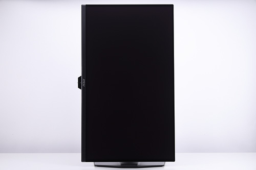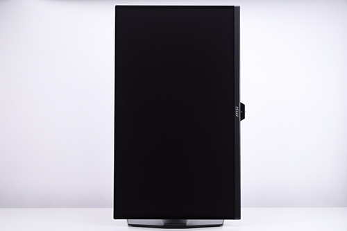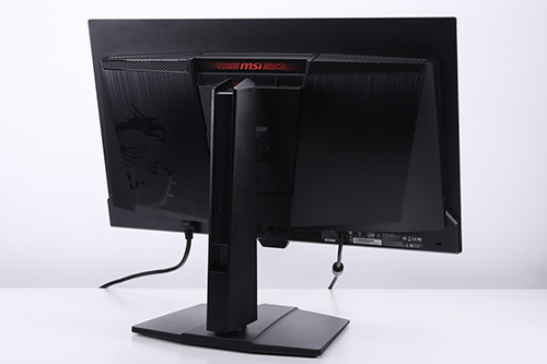 MPG 271QR QD-OLED X50のモニタースタンドは、高さ、チルト(上下角度)、スイベル(左右角度)、ピボット(画面回転)の調整に対応した高機能なもので、支柱部分にはケーブルを通す配線穴が設けられている。