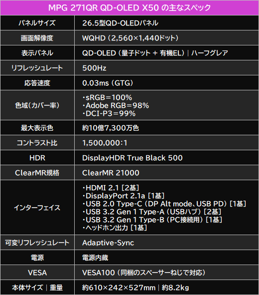 MPG 271QR QD-OLED X50は、26.5型のQD-OLED(量子ドット+有機EL)パネルを採用したモデルで、画面解像度はWQHD(2,560×1,440ドット)。