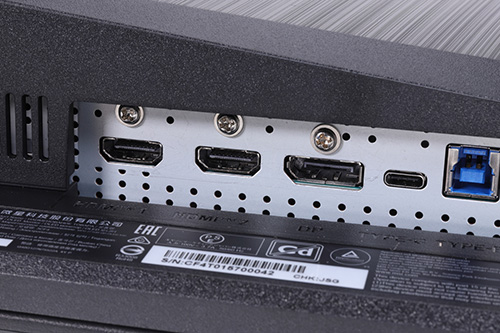 本体背面に搭載されている映像入力用インターフェイスは、DisplayPort 2.1a×1基、HDMI 2.1×2基、USB Type-C(USB 2.0、DP Alt mode)×1基の4系統。いずれのポートでもWQHD/500Hzの映像入力が可能だが、HDMI 2.1に関してはDSC(ディスプレイストリーム圧縮)の利用が必須で、DisplayPortおよびUSB Type-Cに関してもDSC無しで入力するにはPC側の出力ポートがDisplayPort 2.1a以上に対応している必要がある。