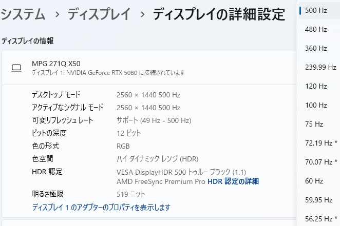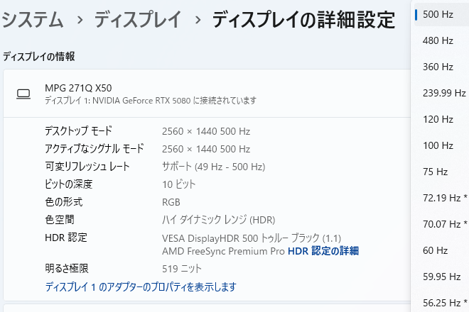 DisplayPort 2.1aは、GeForce RTX 50シリーズをはじめとする最新世代GPUの多くでサポートされているが、ひとつ前のGeForce RTX 40シリーズでは対応しておらず、実際にGeForce RTX 4060 Tiで試してみたところWQHD/500Hzを実現するにはDSCの利用が必須だった。DSCを利用しても表示される映像への影響は実用上感じられなかったが、気になるのであれば最新世代のGPUと組み合わせたい。