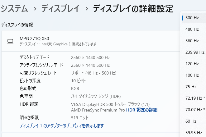 ディスプレイサイズエミュレート機能を使用した場合、可変リフレッシュレート機能のAdaptive-Syncが利用できないという制約が生じたものの、PC側からの入力信号としてはWQHD/500Hzというフルサイズ表示と変わらない解像度とリフレッシュレートで映像入力が可能だった。