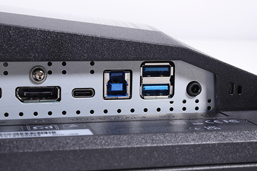 映像入力以外のインターフェイスも背面に配置されており、PCと接続するためのアップストリーム用USB 3.2 Gen 1 Type-B、周辺機器接続用のUSB 3.2 Gen 1 Type-A×2基、ヘッドホン出力が実装されている。