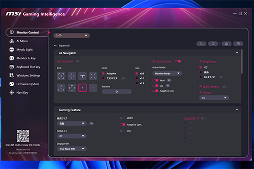 USB接続を介してPCと通信可能なMPG 271QR QD-OLED X50は、ユーティリティソフトの「Gaming Intelligence」に対応しており、OSDメニューと同等の設定をPC上から行うことができる。