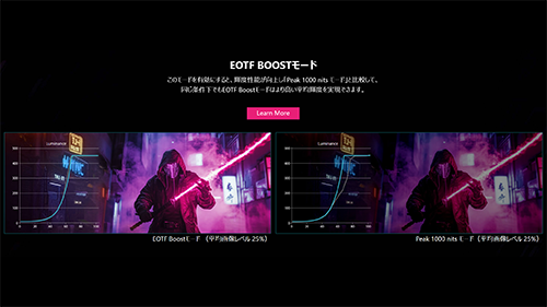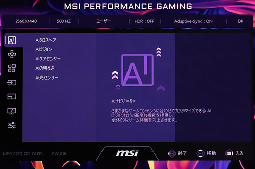 驚異的な表示性能を備えるMPG 271QR QD-OLED X50は、MSIがゲーミングモニター向けに提供している機能を一通り備えたモデルになっており、画面情報に応じて明るさやコントラストを最適化する「AIビジョン」や、QD-OLED向けに用意したHDR機能「EOTFブースト」など、MSI独自のユニークな機能も搭載している。