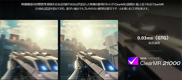 違いをしっかり体感できる500Hz/0.03msの超高速表示ClearMR 21000認証取得の滑らかで明瞭な表示