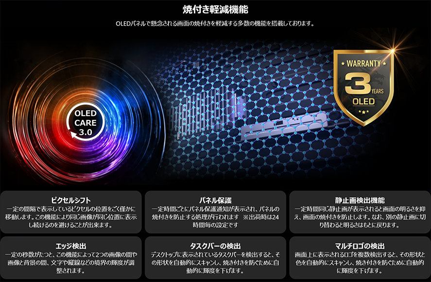 最新のQD-OLED採用モニターであるMPG 271QR QD-OLED X50では、有機EL素子の劣化という課題に対して、MSI最新のOLED保護機能「MSI OLED CARE 3.0」を導入することで対策を講じており、同社の液晶ゲーミングモニターと同等の3年間保証を実現している。