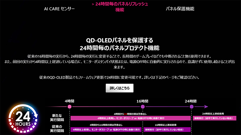 パネルリフレッシュは前回の実行から4時間以上が経過した際、モニターがスリープ状態や電源OFF状態(電源ケーブル経由の通電は必要)になると自動的に実行されるものであり、24時間以上連続で画面を表示させ続けない限り、パネルリフレッシュの存在を意識する必要は無くなるだろう。
