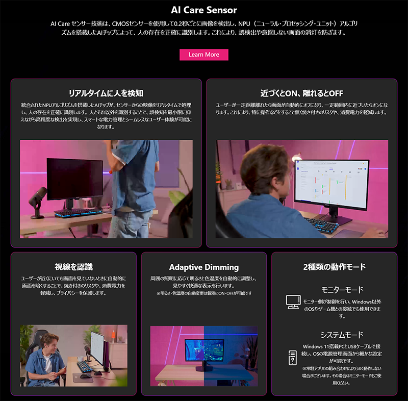 AI Care センサーとは、モニター前面に搭載したCMOSセンサーと、モニター内蔵NPUを組み合わせたシステムで、CMOSセンサーで0.2秒ごとに取得した画像からユーザーの存在や視線を認識し、ユーザーが離席した際にモニターの表示をオフにするLoL(Lock on Leave)、ユーザーが戻ってきた際にモニターの表示を復帰するWoA(Wake on Approach)、ユーザーが視線を外した際に画面の輝度を下げるAdaptive Dimmingを提供する。