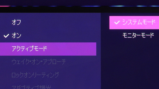 モニターモードとシステムモードでは若干挙動が異なっており、その中でも目立つのは離席によってオフにしたモニターの表示を復帰させるWoAの動作だ。モニターモードでは電源オフ状態からの復帰となるため起動に7秒程度の時間がかかるのに対し、システムモードでは3秒程度で画面の表示が復帰する。