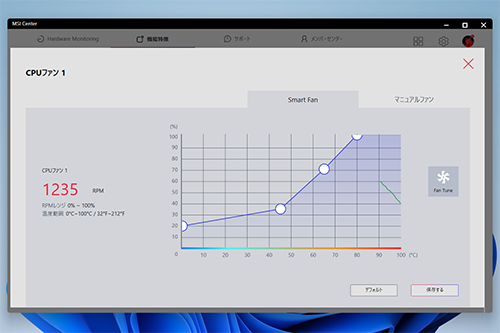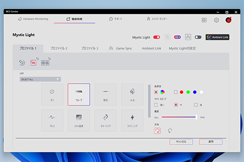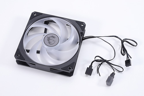 ファン速度やARGB LEDの制御はケーブルで接続したマザーボード側で行う仕様となっており、MSI製のマザーボードに接続した場合はユーティリティソフトの「MSI Center」で一括制御できる。