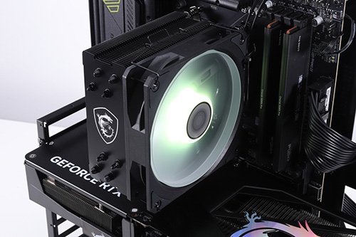ヒートシンクの設計や制御系をシンプル化することで低価格を実現しているMAG COREFROZR AA13だが、ヒートシンクに施されたマットブラックな表面処理は均一性に優れた高品質なもので、冷却ファンのLEDイルミネーションがよく映える見た目をしている。ガラスパネルを採用するPCケースとの組み合わせでも、他のパーツに見劣りしないビジュアルは本製品の魅力だ。