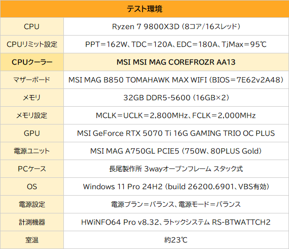 ここからは、MAG COREFROZR AA13をRyzen 7 9800X3Dに搭載して冷却性能をテストする。