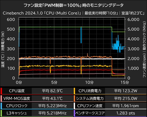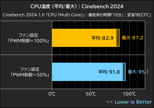 CPU温度はPWM制御100%で平均82.9℃(最大87.2℃)、PWM制御50%で平均91.0℃(最大95.1℃)となっている。