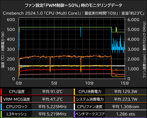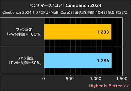 Ryzen 7 9800X3DのTjMaxは95℃なので、PWM制御50%では瞬間的にサーマルスロットリングの作動温度に達しているが、ベンチマークスコアはほぼ同等(1,285前後)なのでパフォーマンスへの影響はほとんど生じていないようだ。