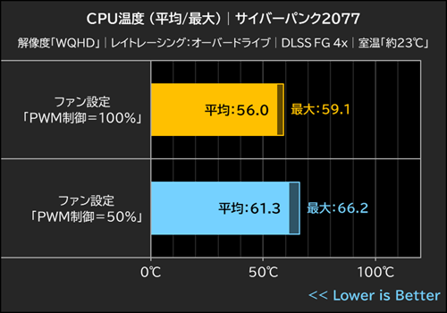 サイバーパンク実行中の平均CPU消費電力は59.9~61.7Wで、Cinebench 2024実行中の半分程度の消費電力=発熱であることもあり、PWM制御を50%未満に絞っても十分に冷却できそうなほど低いCPU温度を維持することができた。