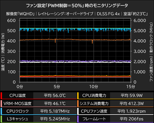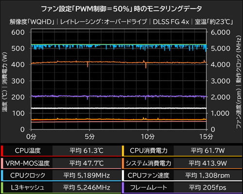 高負荷なゲームとして知られるサイバーパンク2077では、WQHD/1440p解像度にて、グラフィックプリセットを「レイトレーシング:オーバードライブ」、超解像を「DLSS(クオリティ)」、フレーム生成を「DLSS FG 4x」に設定し、15分間連続でゲームを実行した際のモニタリングデータを収集した。