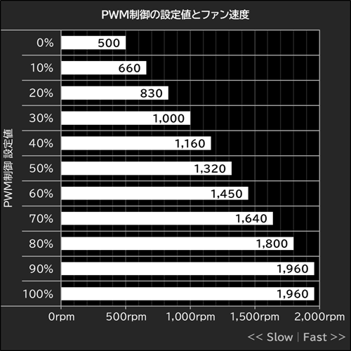 MAG COREFROZR AA13のファン速度は、PWM制御0%の約500rpmから、PWM制御90%の約1,960rpmまで徐々に上昇しており、PWM制御90%~100%の範囲では変化しなかった。スペック上のファン速度は510~2,070rpm(±200rpm)なので、おおむねスペック通りと言える計測結果だ。