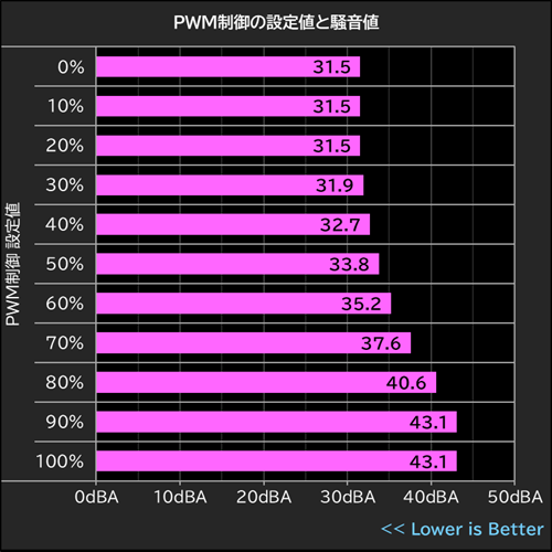 一方、騒音値については、PWM制御0~20%までは電源オフ時と同等の31.5dBAを維持しており、その後はファン回転数が最大に達するPWM制御90%の43.1dBAまで段階的に上昇している。体感的にもファン回転数が1,000rpmに達するPWM制御30%未満の動作音は非常に小さく、PWM制御50%を超えたあたりから動作音が大きくなる印象だった。